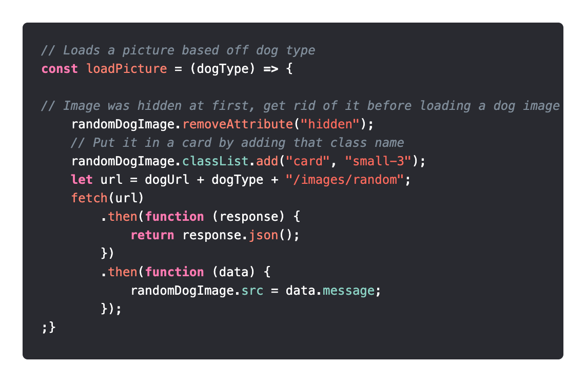 **Notice that we are using data.message, this is what the Dog API has sent us back**